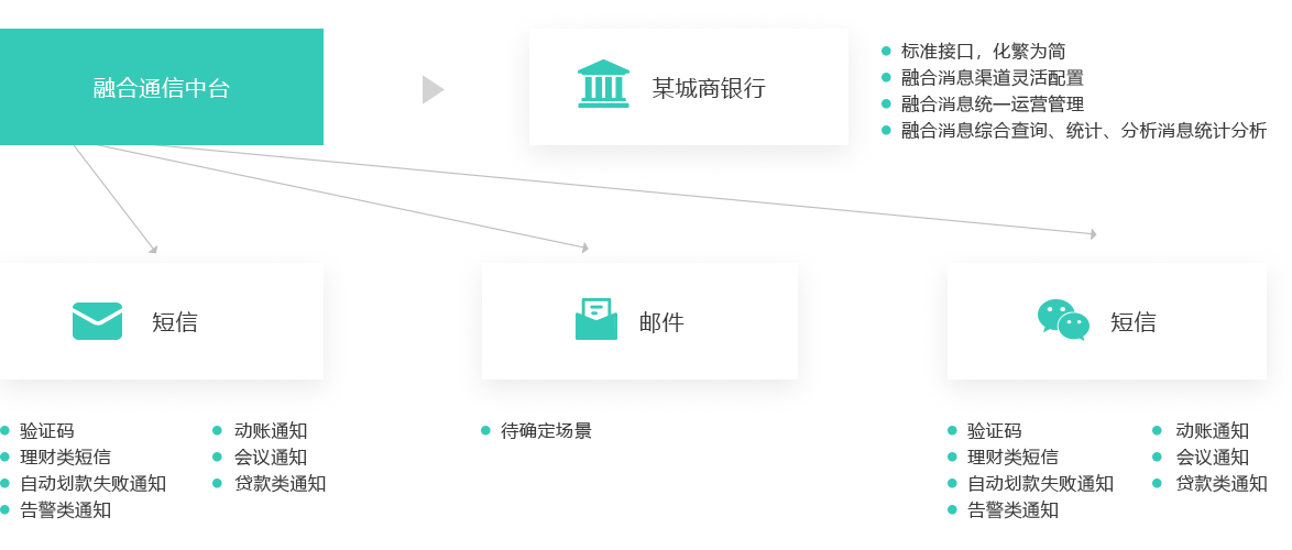 - 银行需要发送消息的权益系统、核心系统、互联网系统与ICC按API标准对接,由ICC再向短信、微信、邮件发送消息,减轻业务系统的对接压力及复杂度